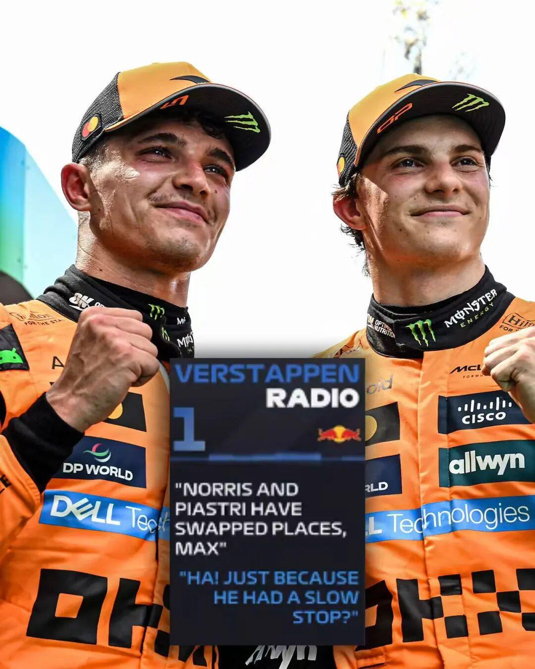 本来是追回3分的局面,硬是被换胎工演成了拉开3分,然而就在第49圈,麦克拉伦策略组告知皮亚斯特里,要求他把位置交还给诺里斯后再进行自由的竞争,小皮在TR里直接回怼:“换胎问题不也是比赛的一部分吗?”尽管如此,小皮还是按照车队要求交还了位置……兵哥直接愤怒,表示FIA应该处罚麦克拉伦。虾哥直接表示,皮亚斯特里尊重指令并且没有攻击诺里斯是留给车队最后的颜面。