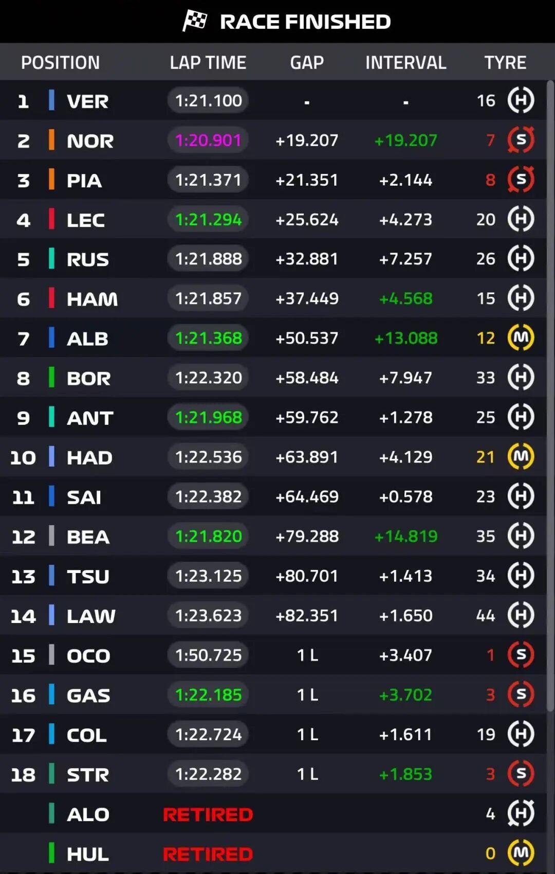 第38圈,维斯塔潘进站换上白胎,出站后很快刷紫,第39圈,汉密尔顿也进站了。但诺里斯和皮亚斯特里都没有选择马上进站,对于诺里斯来说,分站冠军不是最重要的,如何防住身后的皮亚斯特里才是他的课题。