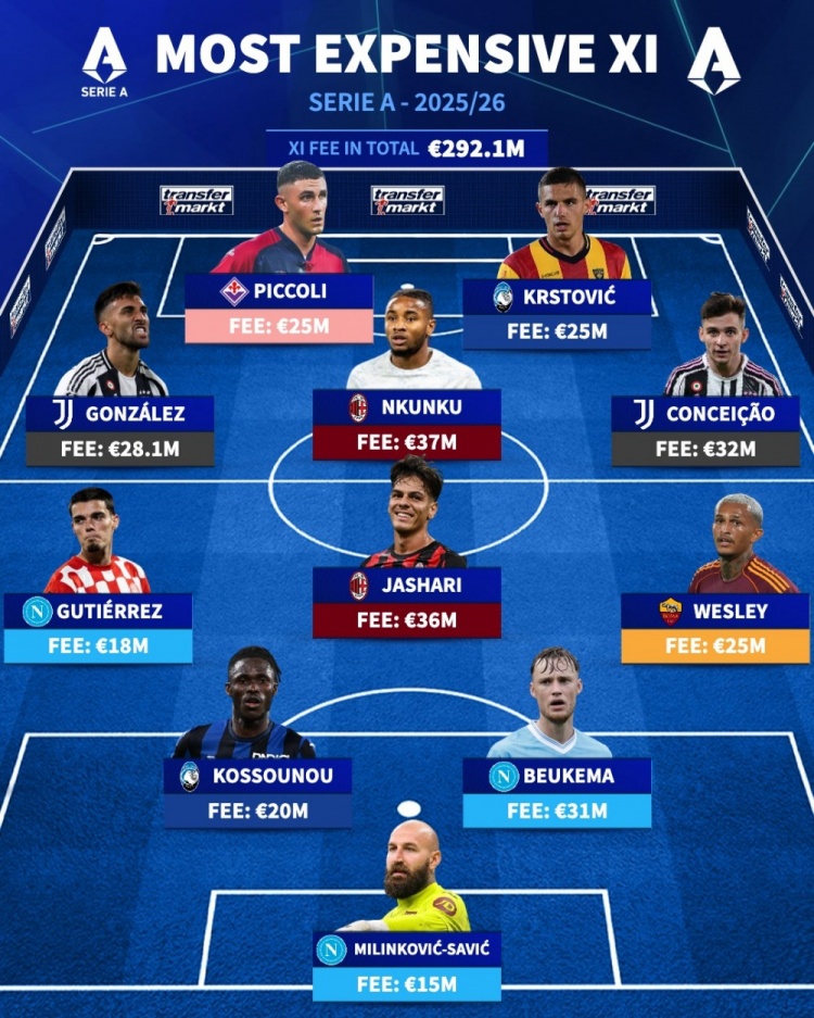 意甲今夏最贵签约阵容(转会费)