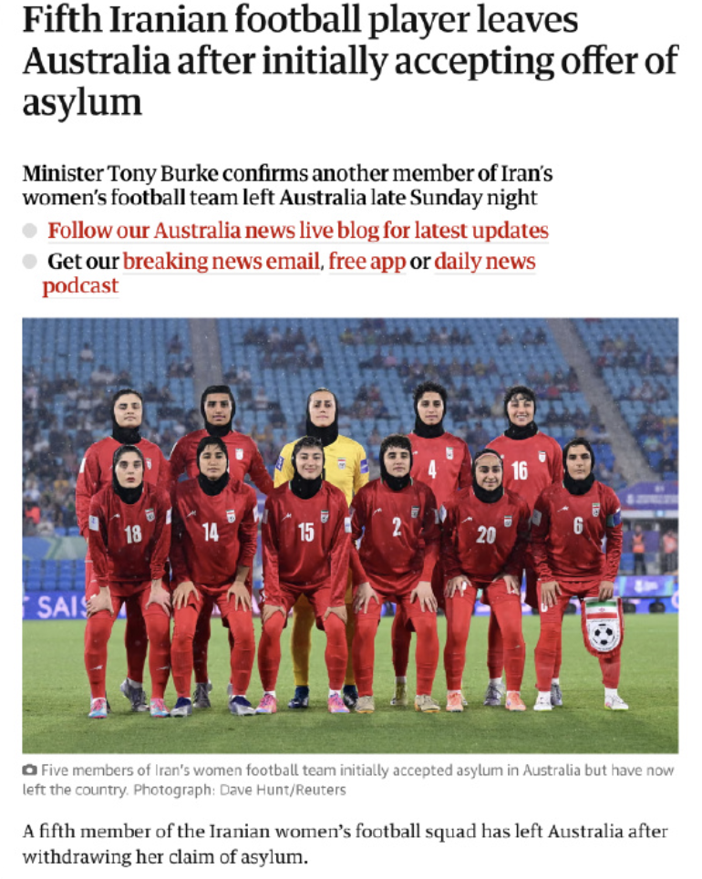今日,3名留在澳大利亚的伊朗女足成员中,又有1人决定离开。英媒《每日邮报》、伊朗国际电视台、澳大利亚ABC等多家媒体指出,伊朗女足队长甘巴里已经撤回庇护申请,并在昨日连夜乘坐飞机回国。